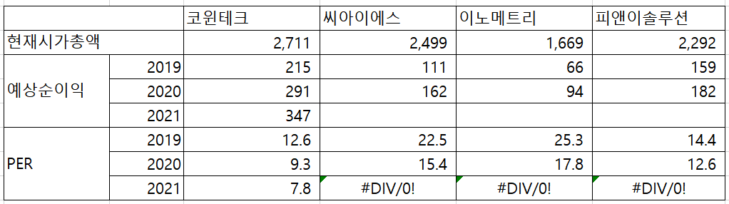- 3개사의 추정 이익대비 현재 시총으로 산정한 PER는 아래 처럼 계산됨.